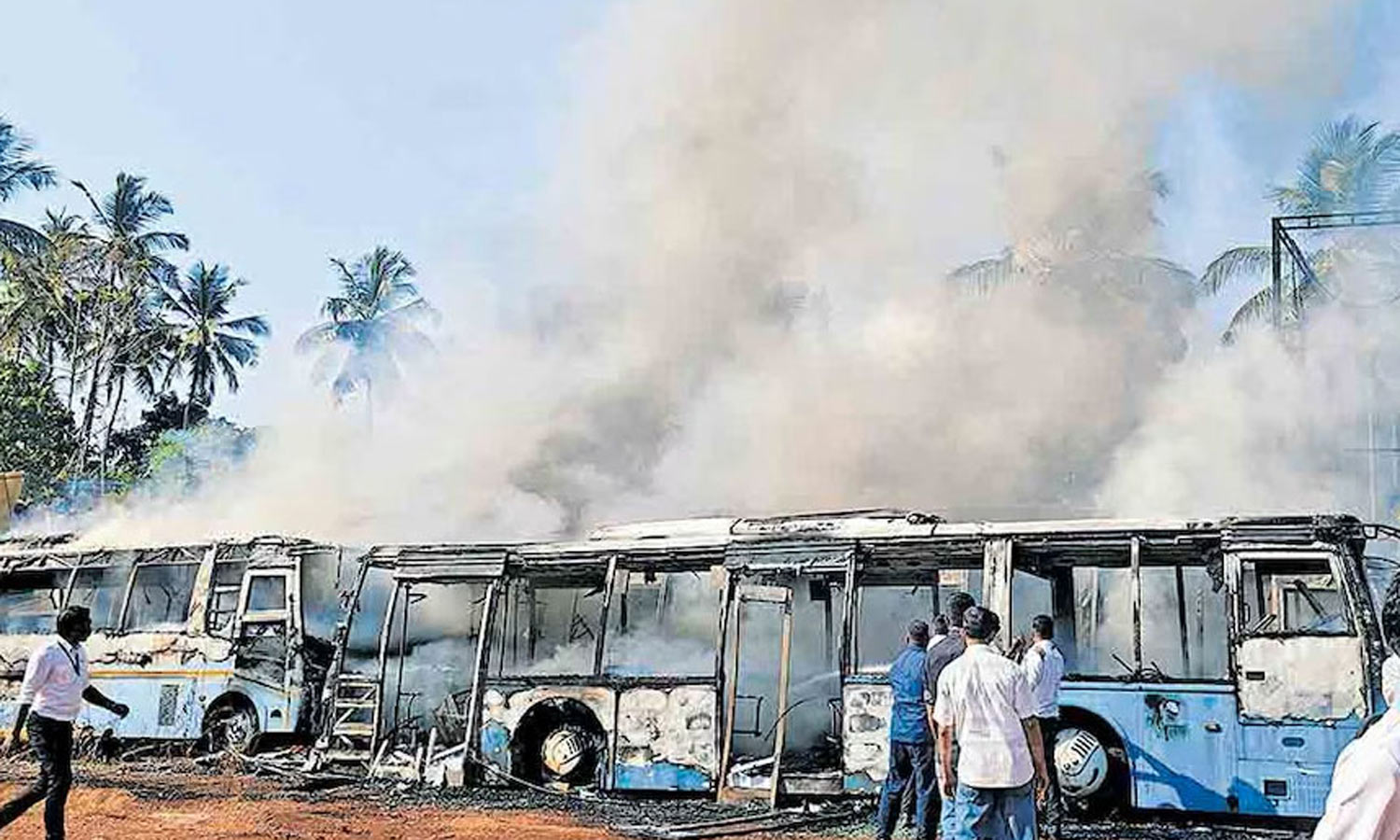 கோழிக்கோடு விமான நிலையம் அருகே 4 பஸ்கள்-ஆம்புலன்சு தீப்பிடித்து எரிந்தன - போலீசார் விசாரணை