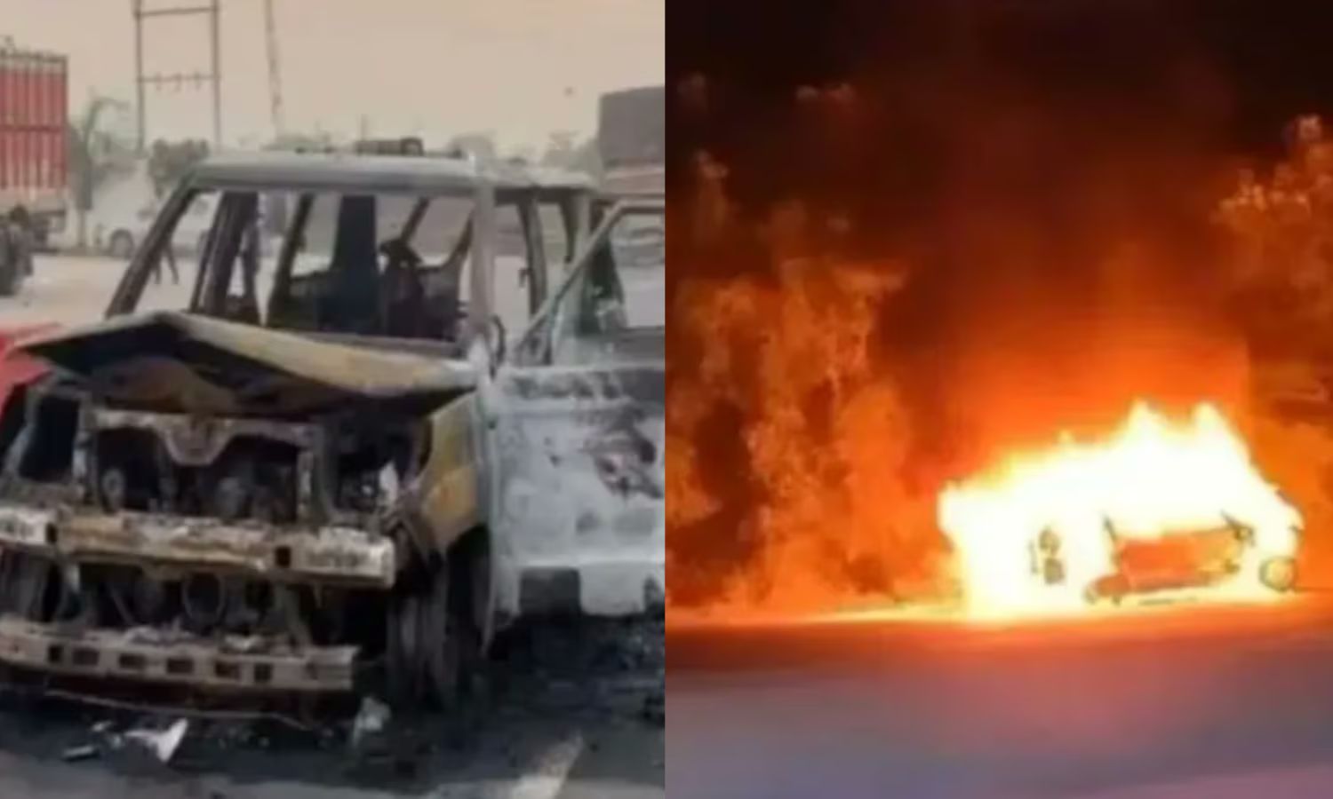 சாலையில் தீப்பிடித்து எறிந்த ஆம்புலன்ஸ்.. பச்சிளம் குழந்தை உட்பட 4 பேர் உடல் கருகி பலி