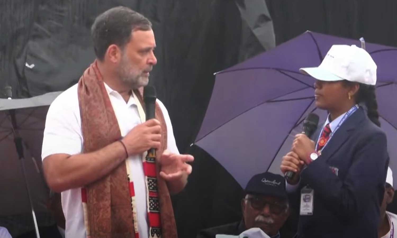 கல்வி தனியார் மயமாகக்கூடாது - கொட்டும் மழையில் பள்ளி மாணவர்களுடன் உரையாடிய ராகுல் காந்தி